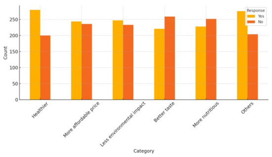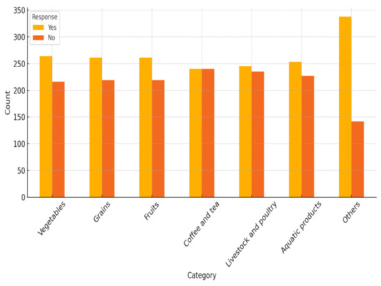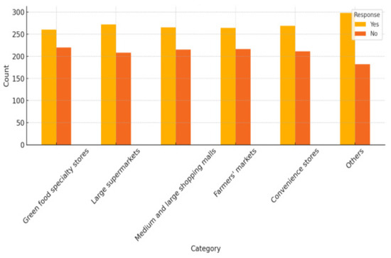 Figure 2, Figure 3 and Figure 4 reveals that Inquiries concerning the participants’ shopping patterns for green foods were also made. With 55.0% of purchases, vegetables were the most popular item of respondents indicating it had bought them, followed closely by grains (54.4%) and fruits (54.4%), likely due to their higher affordability (average price 23% lower than AA-grade certified products) and stronger health benefit perceptions (78% associated vegetables with cardiovascular risk reduction). Livestock and poultry products were purchased by 51.0%, potentially constrained by premium pricing strategies (32% cost surcharge for organic certification), while aquatic products accounted for 52.7%. Coffee and tea demonstrated a balanced purchasing trend, with exactly half of the respondents’ reporting purchases. Other green foods, including specialty or niche products, were purchased by 70.4% of respondents, reflecting broader green food interests. When examining preferred purchasing locations, supermarkets emerged as the most popular choice, with 56.7% of respondents indicating purchases from these outlets. Convenience stores followed closely (56.0%), along with medium and large shopping malls (55.2%), farmers’ markets (55.0%), and green food specialty stores (54.2%). Additionally, 62.1% reported purchasing green food from other sources, demonstrating a reliance on diverse retail channels. Finally, the most commonly cited motivation was healthier options, influencing 58.3% of respondents. Environmental impact and affordability were key considerations for 51.5% and 50.8% of participants, respectively. Better taste and nutritional value were less prominent motivators, affecting 46.0% and 47.5% of respondents, respectively. Other factors, including ethical or sustainability concerns, were considered by 57.5% of respondents.