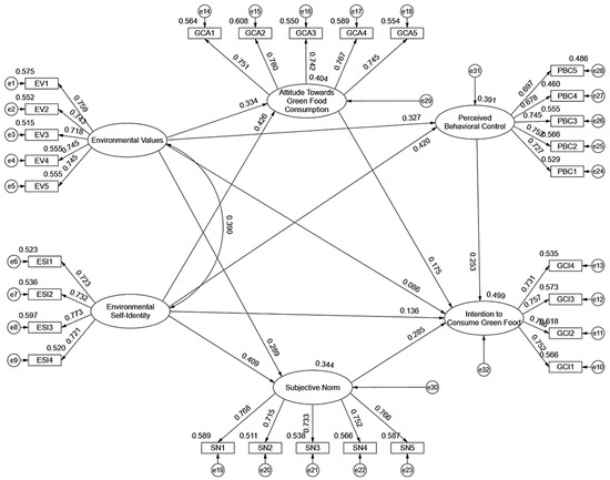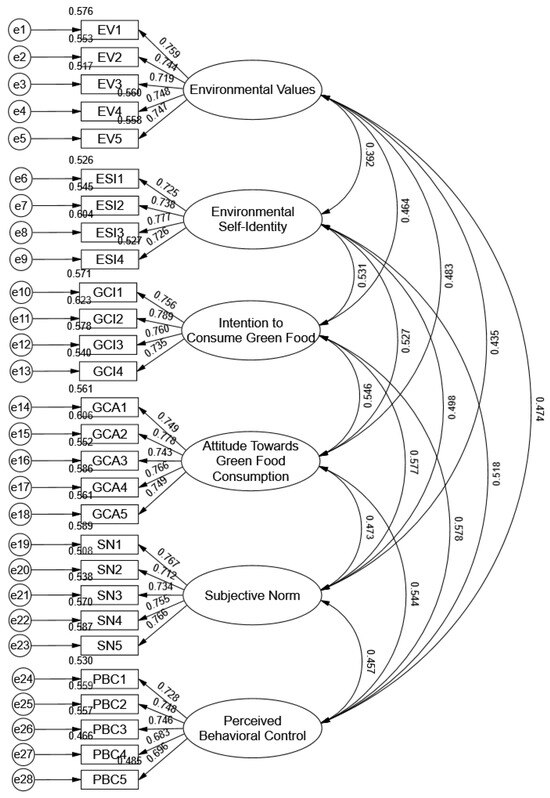 The constructs’ Cronbach’s alpha coefficients are displayed in Table 3. With Cronbach’s alpha values over the 0.7 cutoff, all constructions show good reliability, indicating the measurement’s high internal consistency items [68]. Among these, attitude towards green food consumption (α = 0.870) and Subjective Norm (α = 0.863) show high reliability, underscoring the robustness of these constructs. Other constructs, such as Environmental Values (α = 0.860), Intention to Consume Green Food (α = 0.846), Perceived Behavioral Control (α = 0.843), and Environmental Self-Identity (α = 0.830), also demonstrate excellent internal consistency. These findings confirm that the instrument is reliable for measuring the intended variables, providing a solid foundation for subsequent confirmatory factor analysis and hypothesis testing.