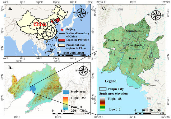 Location Map of Panjin City (a) China (b) China, Liaoning Province (c) Study area, Panjin.