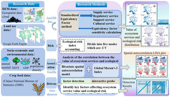 Currently, there is a growing body of research that links ESV with landscape ERI, focusing on two key aspects. On the one hand, it is committed to incorporating ecosystem service value assessment into the landscape ERI assessment methodology to improve the scientific nature of ERI assessment. Cao Qiwen et al. [16] used the degradation of ecosystem services as a loss characterization and constructed a probabilistic characterization index system from multiple dimensions to apply the ESRISK framework for the appraisal of ecological risk in a landscape and made an outlook on the research of geography ecological risk. Brander, LM et al. [17] examined the economic value of ecosystem services provided by 15 terrestrial and marine biomes around the globe, aiming to illustrate their magnitude, trends, and regional differences. On the other hand, research focuses on the connection between ERI in the area and ESV. According to Guo et al. [18], hotspot examination predicated on the Getis-Ord Gi* method showed that the LER evaluation method was improved and coupled with ESV to characterize the landscape vulnerability, and the coupled and coordinated growth of the two revealed different levels of differences. At the same time, the study by Nolander C. et al. [19] highlighted the importance of ESV in quantifying the non-market benefits of forests. This approach offers a more holistic understanding of the true costs and benefits of forest management. The study of the intrinsic mechanisms affecting the interactions between ESV and ERI is crucial, and these insights are essential for promoting the enduring development of regional socio-economic systems and ecosystems, thus ensuring a harmonious balance between human activities and environmental administration [20,21,22].