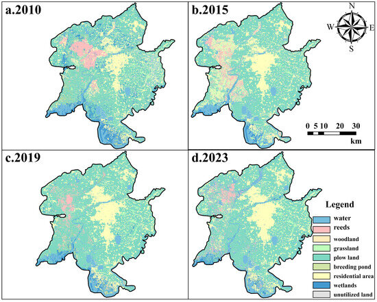 Given the state of the research region and the applicable classification of land usage standards as of right now (GB/T21010-2017 [43]) [44], paired with Panjin City’s unique natural environment and land use features, the research was split into nine landscape types, including arable land, forest land, grassland, waters, mudflat wetland, reed wetland, aquaculture ponds, construction land, and unutilized land. Google Earth Pro 7.3.6 software was used to visually interpret the feature types of Panjin City from 2010 to 2023, and the study area’s sample points had to adhere to the uniform distribution principle [45,46]. The RF algorithm was used to categorize land use according to a ratio of 7:3 for training sample points and validation sample points [47]. The overall accuracy of the classification in Panjin City in each year was higher than 80% and the kappa coefficient was higher than 0.8. The experimental results showed that the classification results were good and the land classification data could satisfy the needs of subsequent research.