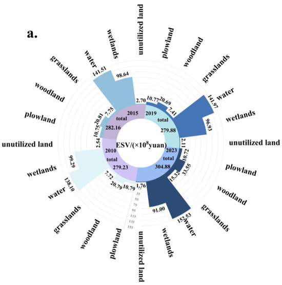 - From 2010 to 2023, the ESV in Panjin maintained a growing tendency, from 279.23 × 108 CNY to 304.88 × 108 CNY, but the growth rate gradually decreased and tended to level off, having a yearly growth rate of an average of 0.71%. This indicates that growth in the ESV may be negatively affected by environmental pressures or human activities and that attention needs to be paid to the sustainability of the ESV; wetlands and watersheds contribute most to the value of ecosystem services and play an indispensable role in the provision of ecological services. The ecosystems of Panjin hold a vital position in sustaining ecological balance and supporting human activities.