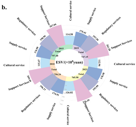 In terms of the ecosystem services in the study area (Figure 4b), the value of each ecosystem service type generally increased from 2010 to 2023, with the ratio of supporting services > regulating services > providing services > cultural services in descending order, and the frequency at which each service changed was 2.56%, −1.21%, 1.98%, and 1.17%. Supporting services had the highest share among the services, and the growth rate was 2.56%, signifying that the study zone is performing better in maintaining ecological processes and biodiversity. There was a negative growth in regulating services, which may indicate a weakening of functions in climate regulation and water purification and may be pertinent to factors such as land use changes and environmental pollution. The opposite growth trends of supporting and regulating services indicate that there is an imbalance between the different functions of the ecosystem in the study zone.