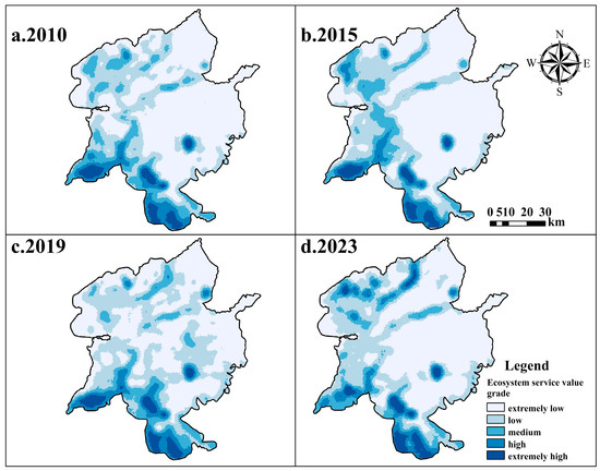 Spatial distribution of ESV in the study area 2010–2023 (a) 2010; (b) 2015; (c) 2019; (d) 2023.