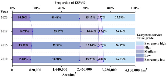 High-value areas showed a concentrated point-like distribution, mainly distributed in high-value areas around the Liaohekou National Nature Reserve and the Daling River and Liaohe River, etc (Figure 5). The predominant categories of land utilization in such regions were dominated by watersheds, wetlands, and farm pond land. The maximum change in the extremely high ESV zone between 2010 and 2023 was 7572.30 hm2, and the percentage of change was 1.83% (Figure 6). During a specific period of the research timeframe, the proportion of this type of area revealed an upward trend because this type of area has a good ecological background, is less distressed by human beings, and is supported by relevant conservation of the earth policies, so it maintains a relatively high level of natural system service offering in this area. The overall trend in size over the study period was upward, and the protection and management of the area still needs to be maintained and strengthened.