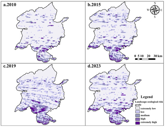 Spatial distribution pattern of ecological risks in Panjin, 2010–2023 (a) 2010; (b) 2015; (c) 2019; (d) 2023.