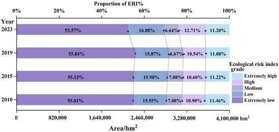 Areas and their proportions of ecological risk zones of various classes in Panjin City, 2010–2022.