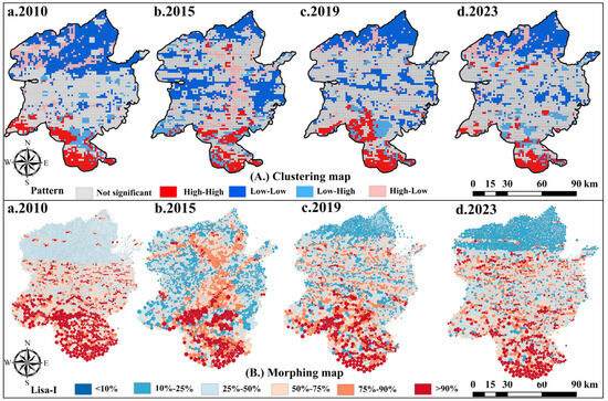 Spatial autocorrelation LISA of ESV per unit area and ecological risk index in Panjin City, 2010–2023. (A) Clustering Map; (B) Morphing map; (a) 2010; (b) 2015; (c) 2019; (d) 2023.