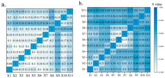 Results of Interaction Detection in the Study Area (a) Spatial divergence results for ESV; (b) Spatial divergence results for ERI; labels X1 to X11 represent temperature, annual precipitation, normalized vegetation index (NVDI), elevation, slope, population density, land-averaged GDP, urbanization rate, land use type, ecosystem service value, landscape ecological risk, and anthropogenic impact index.