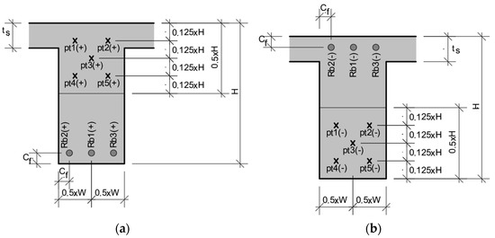 Two beam cross-sections were considered in the analysis (B1 and B2, as shown in Table 3). The cross-section width (W) and height (H) of both beams are shown in Table 3 and Figure 1. The thickness of the slab (ts) was set at 120 mm. The cross-section shown in Figure 1a contains the control points assumed to determine the average temperature of steel and concrete for the design of the sagging bending resistant moment (+) of the RC beams (the concrete temperature above the neutral axis and the positive steel reinforcements as used in the conventional structural design procedure). The same in Figure 1b, but for the hogging moment (−).