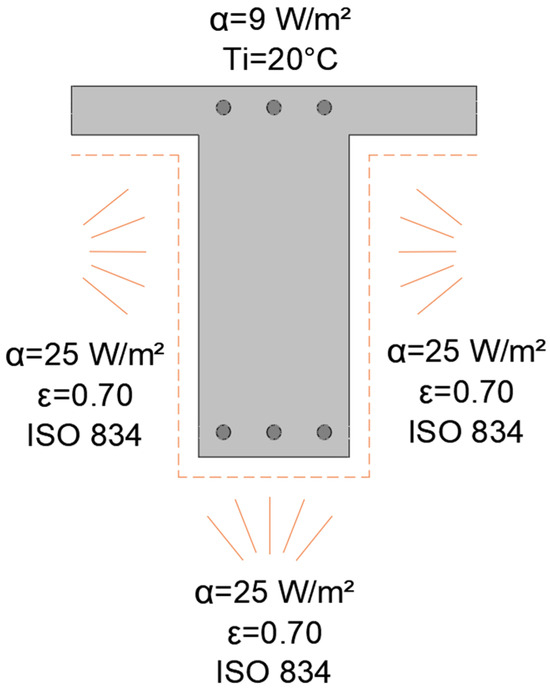 Equation (2) defines the governing equation for convective and radiative heat transfer process [16], where and are the vector components of the outward perpendicular to the cross-sectional area; and are the radiative and convective heat transfer coefficients, respectively; T is the ambient temperature (assumed as 20 °C) and is the temperature of the environment subjected to fire (considered as ISO 834 [17] standardized time-temperature, as proposed by EN 1992-1.2 [13] to structural design in case of fire). The radiation heat transfer coefficient is given by Equation (3) (it was assumed for all cases, as there is no discussion about this coefficient for the eco concretes), where is the Stefan-Boltzmann constant (σ = 5.67 × 10−8 W/m2 ), and the emissivity factor (assumed as 0.70 according to EN 1992-1.2 [12]). As shown in Figure 2, the convective heat transfer was 25 and 9 W/m2 °C on the surface exposed to the fire and the unexposed surface respectively. Heating was applied to the bottom surface of the beam, as is common in residential buildings exposed to internal fires.