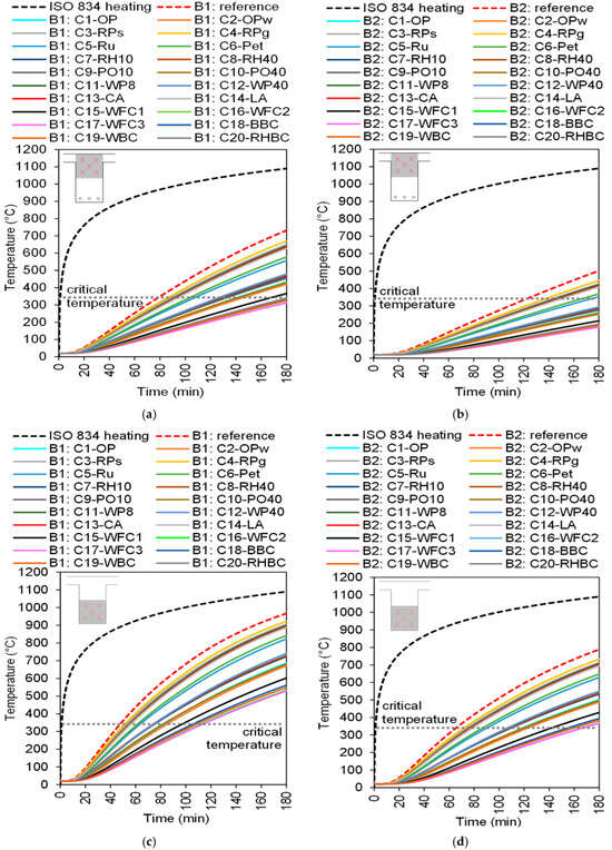 The temperature profile in the concrete cross-section is shown in Figure 3. Figure 3a and Figure 3b show the average temperature between pt1(+) to pt5 (+) control points to B1 and B2 beams, respectively. Figure 3c and Figure 3d show the same for the average temperatures from pt1(−) to pt5(−) for B1 and B2 respectively. The critical temperature of concretes (around 350 °C) stated in the literature was also emphasized. Appendix B shows the temperature in some standardized times.