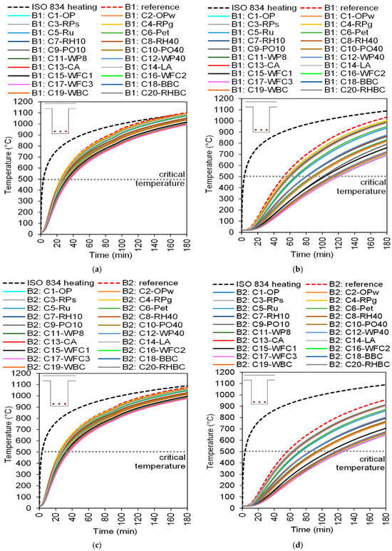 Is important to note that in all tested cases of environmentally friendly beams, the critical temperature of the reinforcement is not reached. However, with a concrete cover thickness of C = 50 mm, the beam produced with the reference concrete (i.e., conventional materials) reaches 500 °C, which leads to mechanical damage of the hogging bending moment in B1, which has the smaller cross-sectional dimensions.