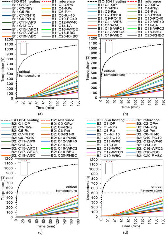 The temperature distribution in the negative reinforcements of the beams during the fire exposure is shown in Figure 5. Figure 5a and Figure 5b apply to beam B1 with 20 and 50 mm concrete cover respectively. Figure 5a,b apply to beam B2 with 20 and 50 mm concrete cover. The temperatures presented refers to the average between the Rb1(−) to Rb3(−) control points shown in Figure 1. Appendix B also shows the temperature in some standardized ISO 834 [17] times.