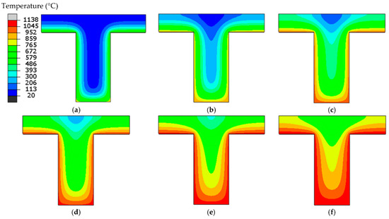 Temperature field in the beam cross-section during different times of the ISO 834 fire (B1 cross-section). (a) 30 min, (b) 60 min, (c) 90 min, (d) 120 min, (e) 150 min, (f) 180 min.