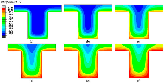 Temperature field in the beam cross-section during different times of the ISO 834 fire (B2 cross-section). (a) 30 min, (b) 60 min, (c) 90 min, (d) 120 min, (e) 150 min, (f) 180 min.
