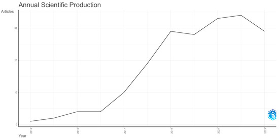 In addition to the key statistics discussed, the final two indicators in Table 4 provide insights into the content of the documents. The dataset contains 573 “author’s keywords”, resulting in an average of approximately 3 (2.97) keywords per document. The “keywords plus” indicator, totaling 255, represents keywords extracted from the titles of articles that were cited, with an average of approximately 1 (1.32) keywords plus per document.