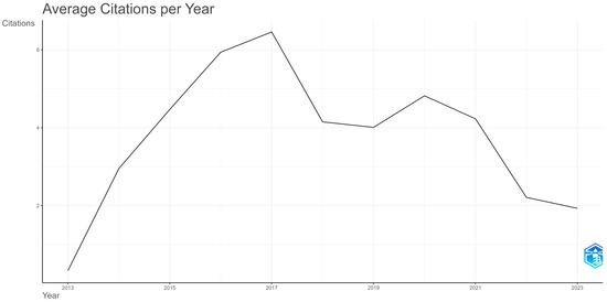 Figure 3 shows the average citations per year for the selected articles in the dataset with regard to MOOC dropout. Until 2017, this indicator steadily increased, starting at 0.33 in 2013 and reaching 6.46 in 2017. During the same period (2013–2017), the “average citations per article” indicator also showed rising values, starting at 4 and reaching 51.7 by 2017. This suggests a growing interest in scientific research in this field during that time.