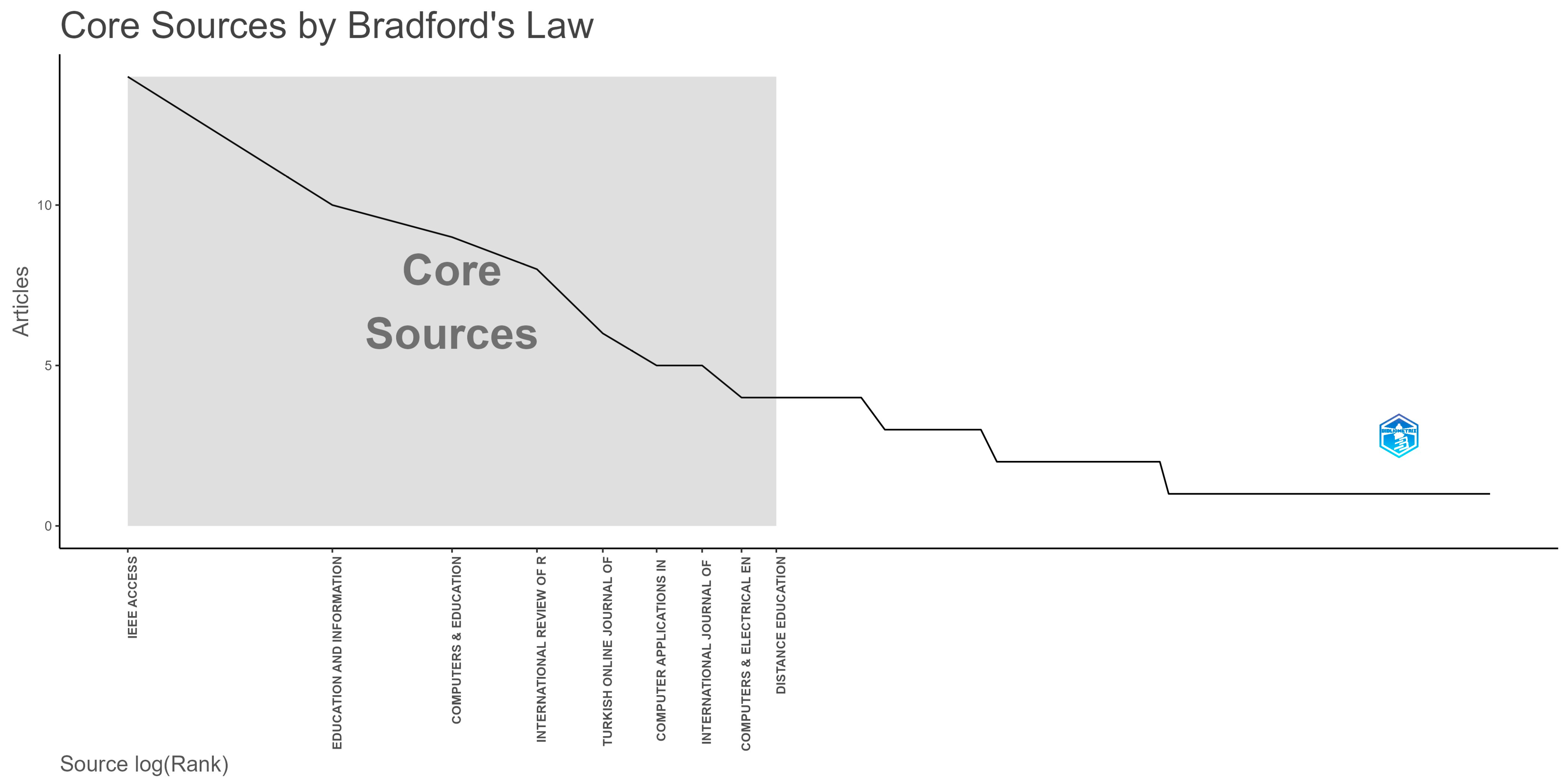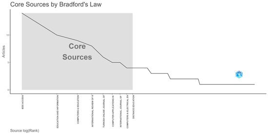 To examine the most cited publications, Figure 5 applies Bradford’s law. Essentially, Bradford’s law identifies a core group of journals with the highest concentration of articles on a specific topic, surrounded by additional clusters with varying publication frequencies. These peripheral clusters, being further from the central topic, contain fewer articles in the analyzed domain [86,87].