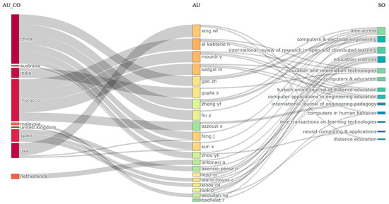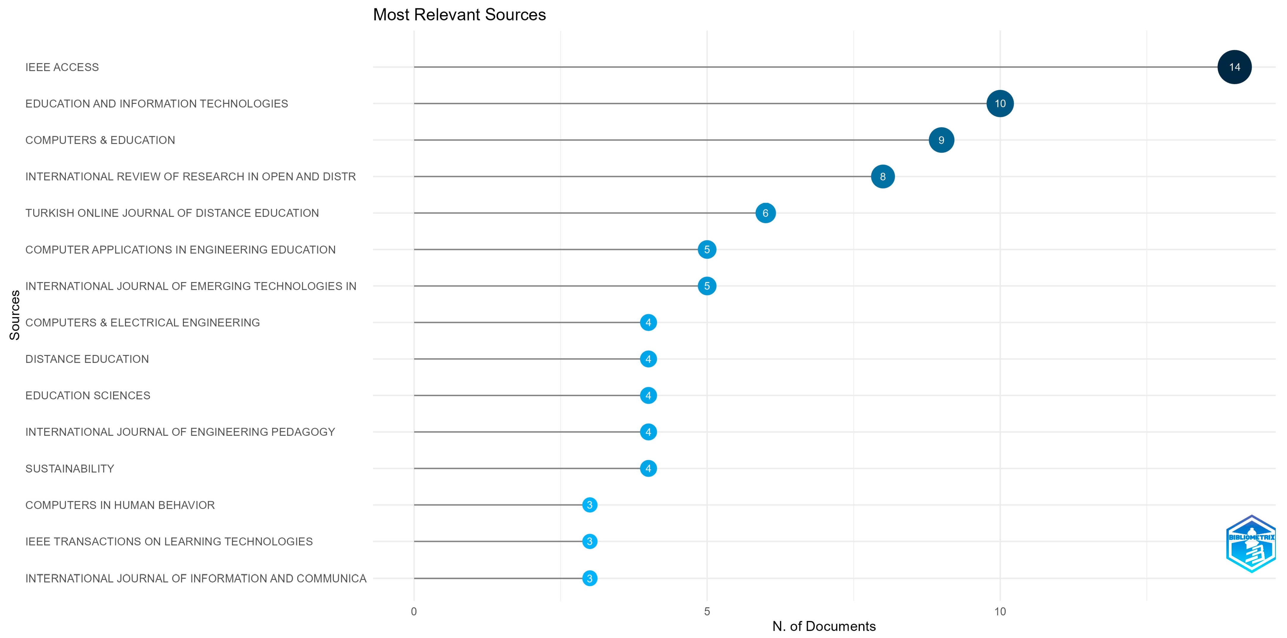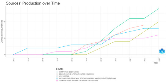The next journal, “Education and Information Technologies”, has published 10 articles, combining education with information technology to provide insights across various levels. Following this is “Computers & Education” with nine articles and “International Review of Research in Open and Distributed Learning” with eight articles, both of which focus on how technology supports the open learning process in online environments. Additionally, five journals each have four publications in the top list: “Computers & Electrical Engineering”, “Distance Education”, “Education Sciences”, “International Journal of Engineering Pedagogy” and “ Sustainability”.