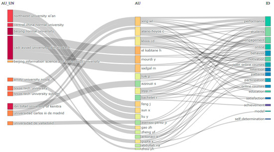 Table 6 provides a clearer view of author collaboration, and the information in it was obtained using the data in the extracted dataset. By dividing the “authors of single-authored documents” by “single-authored documents”, it reveals that, on average, single authors have nearly one paper each (0.95). Additionally, there are, on average, 0.34 papers per author and 2.93 authors per paper. The average number of co-authors per document is 3.45. These data again highlight that authors show a strong interest in collaboration, likely driven by the need to comprehensively analyze the factors influencing MOOC dropout.