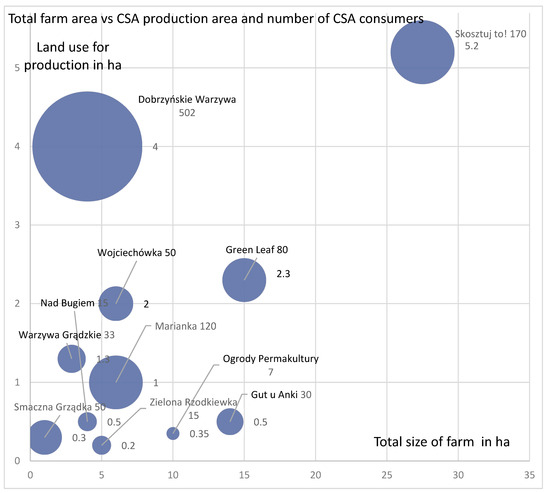 When assessing the scale of CSA farms, two key indicators should be considered: the total farm area and the specific area allocated for CSA crop production. At the same time, CSA Farma Stary Jesion is the largest in total area (36 hectares), with only 2 hectares dedicated to vegetable cultivation (Figure 2). Similarly, the Wrocław University of Life Sciences, the second-largest producer, utilises two research stations with 25 hectares under cultivation alongside 1200 square meters of tunnel-grown crops. An exception to this pattern is CSA Dobrzyńskie Warzywa, where all 4 hectares are dedicated solely to food production. This farm also distinguishes itself in output, preparing 502 weekly deliveries for the 2024 season. Each delivery consists of a selection of seasonal crops tailored to household needs. Among the remaining farms, the cultivated areas dedicated to CSA production range from 0.2 hectares (CSA Zielona Rzodkiewka) to 0.3 hectares (CSA Smaczna Grządka and CSA Green Leaf). However, in all cases, the total farm area extends beyond the portion used for CSA cultivation.