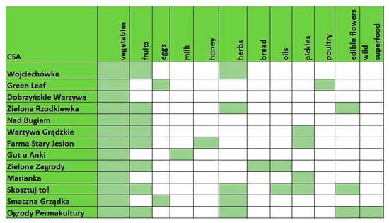 Most are in central and eastern Poland, with a few exceptions (Figure 1). One farm is situated in the north, in the West Pomeranian Voivodeship (CSA Stary Jesion), another farm in the Podkarpackie Voivodeship in southern Poland (CSA Smaczna Grządka) and a group of CSA farms operating at the Wrocław University of Environmental and Life Sciences. In the latter case, one can talk about a specific social innovation, which is the formula of providing food to employees with the specifics of the CSA model (among other things, commitment to the season and composition of weekly deliveries resulting from current crops).