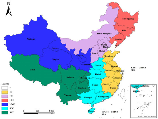 This study encompassed 31 provinces, municipalities, and autonomous regions in mainland China; Taiwan, Hong Kong, and Macao were excluded due to data limitations. To identify the discrepancies in NH3, N2O, and CH4 emissions in different agricultural regions across China, we classified the study area into six regions based on the distribution of agricultural product systems and codes for the administrative divisions of the Peoples Republic of China [39]. As shown in Figure 1, the agricultural regions in China are divided into six parts: Northeast China (NEC: Liaoning, Jilin, and Heilongjiang), North China (NC: Beijing, Tianjin, Shanxi, Hebei, and Inner Mongolia), East China (EC: Shanghai, Jiangsu, Zhejiang, Anhui, Fujian, Jiangxi, and Shandong), South Central China (SCC: Henan, Hubei, Hunan, Guangdong, Guangxi, and Hainan), Southwest China (SWC: Chongqing, Sichuan, Guizhou, Yunnan, and Tibet), and Northwest China (NWC: Shaanxi, Gansu, Qinghai, Ningxia, and Xinjiang). The base year for the emission inventory was 2021.