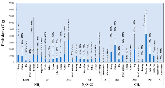 Figure 2 illustrates the uncertainty ranges for different agricultural emission sources of NH3, N2O, and CH4. Overall, the NH3 and N2O emissions exhibited higher uncertainties compared to CH4. The largest source of uncertainty was LMM, with total uncertainties of −71–113% for NH3, −81–212% for N2O, and –64–96% for CH4 (95% confidence). Poultry NH3 (−98–520%), cattle CH4 (–89–293%), and sheep N2O (–77–187%) emissions exhibited the greatest uncertainty, driven by substantial variations in emission factors in breeding periods and livestock management practices of regional differences. For CF, the uncertainties were lower, at −56–79% for NH3 and −44–67% for N2O. Among crops, fruit trees (−97–463%) and maize (−100–368%) showed higher NH3 uncertainty than wheat (–48–75%) and rice (−72–84%), which were influenced by factors such as fertilizer type, soil properties, weather, and application methods. The uncertainties in CH4 emissions from LEF were influenced by the species of livestock: sheep (−80–109%), pigs (−13–14%), cattle (–38–53%), and draft animals (86–137%). CH4 emissions from PC exhibited lower uncertainties (–43–56%), with single rice, late rice, and early rice showing values of −71–82%, −59–85%, and 62–63%, respectively. Aquaculture emissions in both freshwater and mariculture showed high uncertainties for CH4 (−99–536%) and N2O (−96–568%) due to significant regional variations and limited data availability; thus, further investigation is required.