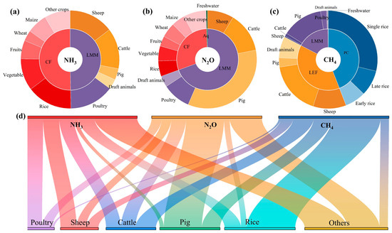 Figure 3. Source contributions (Unit: %) to agricultural NH3, N2O, and CH4 emissions in China in 2021. (a) NH3; (b) N2O; (c) CH4; (d) NH3, N2O, and CH4 combined.