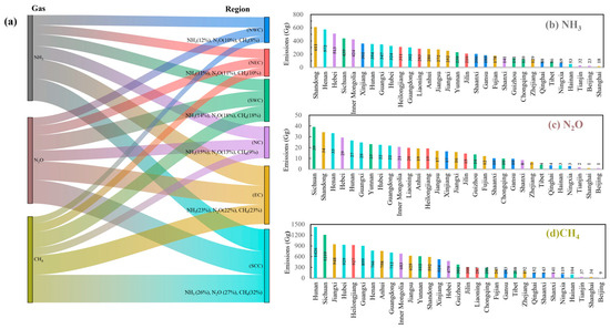 Figure 4. Regional emission contributions (a) and provincial (b) NH3, (c) N2O, and (d) CH4 emission distribution (Gg).