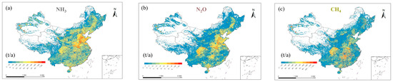 Figure 6. Spatial distribution of agricultural emissions in China in 2021: (a) NH3, (b) N2O; (c) CH4.