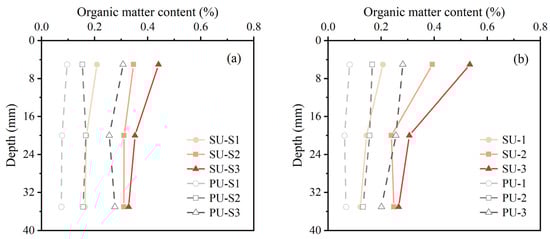 Organic matter distribution along the depth of each treated specimen: (a) without urea; (b) with urea.