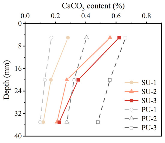 Figure 4 shows the distribution of CaCO3 content along the depth of each EICP-treated specimen. The CaCO3 distribution in SU-treated specimens followed a trend similar to that of organic matter. For SU-1, the CaCO3 content in the upper part (about 0.29%) was about 2.4-times higher than that in the bottom part (about 0.12%). After multiple treatments, the CaCO3 content of SU-treated specimens increased, while the spatial distribution inhomogeneity was aggravated. The CaCO3 content in the top of SU-3 was about 2.8-times higher than that in the bottom layer. By comparing the CaCO3 content of SU-treated specimens in the same region, it was found that the growth rate of CaCO3 content decreased with additional treatment cycles. For example, the CaCO3 content in the top layer increased by 97% from SU-1 to SU-2 but only by 10.7% from SU-2 to SU-3. In particular, the CaCO3 contents at the bottoms of SU-2 and SU-3 were almost identical, suggesting that the third treatment cycle was ineffective for the bottom soil. The inhomogeneous CaCO3 distribution of SU-treated specimens may have been related to the high amount of organic matter provided by the crude soybean urease. As described in Section 3.1 and Section 3.2, organic matter and CaCO3 precipitation occurred simultaneously, and the rate of organic matter precipitation was significantly higher at the initial stage of the reaction. The relatively high amount of organic matter in soybean urease would increase the viscosity of the treatment solution, and co-precipitation of organic matter and CaCO3 would occupy the soil pores rapidly, resulting in a decrease in the permeability in the upper part of SU-treated specimens. When the permeability in the upper part of the soil was low, it was difficult for the treatment solution to be distributed evenly in the sand specimen. As a result, more CaCO3 was precipitated in the upper layer of the soil. A similar phenomenon was reported by Liu et al. [26] and Cui et al. [55], who found that the distribution of CaCO3 content for EICP-treated sand with crude soybean urease was more uneven compared to that with other types of ureases under multiple treatments.
