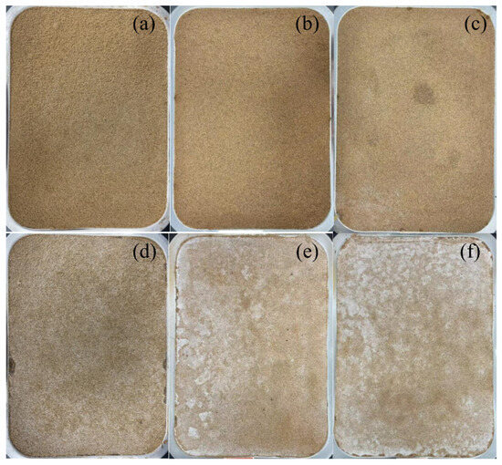 Previous studies have employed various wind erosion devices, such as wind blowers [46] and sirocco fans [47]. The results showed a consistent trend with those obtained using professional wind tunnels [14,48], demonstrating the availability of these erosion devices. In this study, the test equipment (Figure 1) and wind-sand flow simulation method followed the approach described by Liu et al. [33]. The air current was generated using a 1000 W fan and passed through a diffuser to minimize turbulence. An anemometer (AS386, Smart Senor Co., Ltd., Hongkong, China) was used to measure the wind velocity at the sand surface. Desert sand particles were introduced into the airflow through a sand feeder to simulate wind-blown sand flow with a steady flux. The sand supply rate was calculated as the amount that the airflow at a given velocity could carry, which was approximately consistent with the measured value [33,49]. In this study, soil mass loss was adopted as the indicator to evaluate the wind erosion resistance of specimens, which refers to the loss of soil mass per unit time and unit area at a certain wind velocity [50,51]. The treated specimens were weighed per minute using a 0.01 g accurate balance under 10 m·s−1 wind velocity for 12 min.