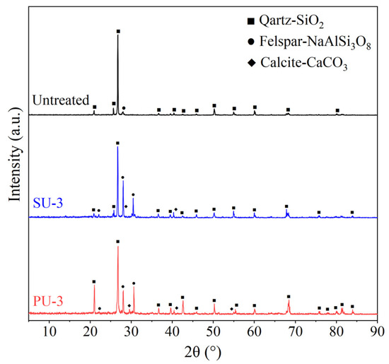 X-ray diffraction (XRD) analysis of untreated sand, SU-3, and PU-3.