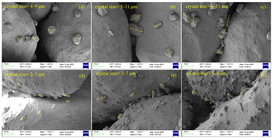 SEM images of EICP-treated specimens: (a) PU-1; (b) PU-2; (c) PU-3; (d) SU-1; (e) SU-2; (f) SU-3.