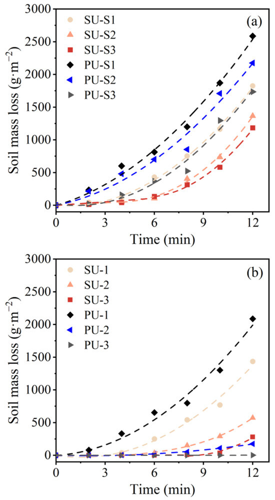 Soil mass loss of the treated specimens at 10 m·s−1 wind velocity: (a) without urea; (b) with urea.