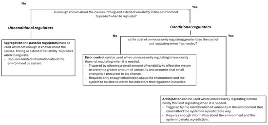 The type of regulator used to manage a system depends, to begin with, on whether the cause, timing, and extent of variability in the state of an environmental input into the system can be predicted (see Figure 1). An unconditional regulator must be used if this variability cannot be predicted. In other words, an unconditional regulator must be used when, given the characteristics of appropriate system response(s), there is not sufficient time to find out more about the cause, timing, and extent of variability before action must be taken [7].