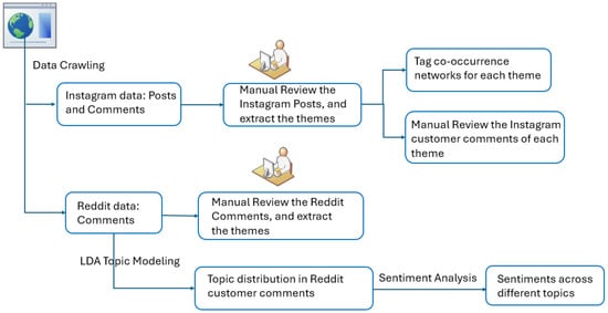 To obtain the relevant data from Reddit, the search term “#fashion greenwashing” was used to identify pertinent posts and comments. Only posts that had a minimum of five comments were considered for analysis to ensure sufficient depth of discussion. To obtain the relevant data from Instagram, the researchers used the search term “#fashiongreenwashing”. Only the posts with “#fashiongreenwashing” tags would be identified and collected with the customer responses. Some Instagram posts were hidden and could not be crawled. Posts and comments in other languages were excluded using Python-based language detection tools. Overall, 446 comments from 12 distinct posts were collected from Reddit and 76 posts with 370 customer reviews were collected from Instagram using Python 3.11.8 on 28 June 2024. To accurately classify the topics and explore the underlying reasons for praise and complaints, each Reddit user comment was split into sentences. A total of 1927 sentences were obtained from the whole textual dataset. A text-mining research schema was built to extract and analyze the information from the text data source, as shown in Figure 1.