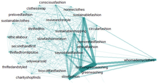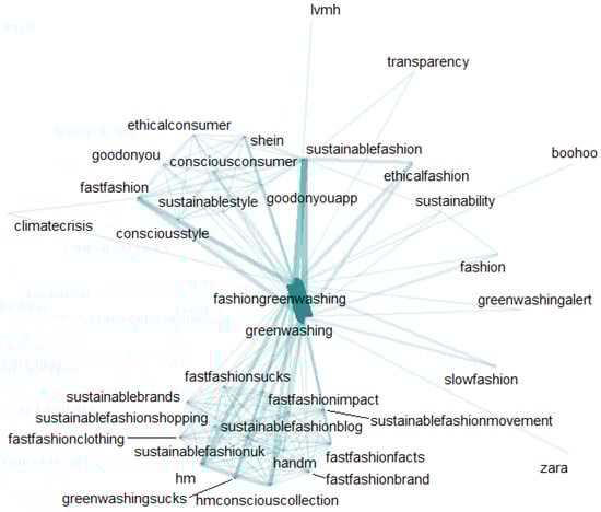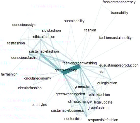 In the Instagram captions with the tag “#fashiongreenwashing”, three major themes were manually categorized by the researchers. The tag co-occurrence network of Instagram captions on three themes are also shown in Figure 2, Figure 3 and Figure 4. In a tag co-occurrence network, nodes are tags occurring in the corpus, and an edge between two tags indicates that the connected two tags have co-occurred in the same post at least once. The frequencies that two tags co-occurred are accumulated and defined as the weight of the corresponding edge between them [79].