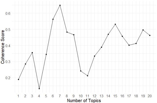 The optimal number of topics are determined by coherence scores. According to Figure 5, when the number of topics is 7, the coherence score is highest (0.653). Therefore, we chose to extract 7 topics from the Reddit discussion data.
