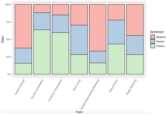 The topics extracted by the LDA algorithms are displayed in Table 2, where each topic is represented by eight dominant keywords. Overall, there were seven topics extracted from the Reddit discussion data, which are fashion greenwashing marketing, carbon footprint, conscious consumption, plastic recycling, circular consumption, ethical luxury, and natural fabric. Figure 6 shows the sentiment across different topics in Reddit discussion.