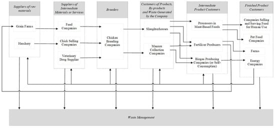 The poultry supply chain is multifaceted, involving stages such as feed production, chick rearing, slaughter, distribution, and waste management. Coordination among various stakeholders, including agricultural companies, breeding firms, and waste management entities, is essential to optimize production processes, reduce costs, and ensure sustainability. Localizing poultry production and processing facilities can reduce transportation costs and environmental impacts, including the carbon footprint [9,10]. Various studies have focused on optimizing poultry supply chains by exploring different models, management styles, and technological innovations [7,11,12,13,14,15,16,17,18,19,20,21,22,23,24]. Collectively, these studies highlight the significance of vertical integration, regulatory responses to environmental challenges, the integration of artificial intelligence, and sustainability efforts in optimizing poultry supply chains. Animal welfare is also a significant consideration, particularly during transport, where birds face stressors that can negatively impact meat quality and animal health [25,26,27]. Figure 1 illustrates the poultry supply chain, highlighting the interactions among various stakeholders involved in the production and distribution process.