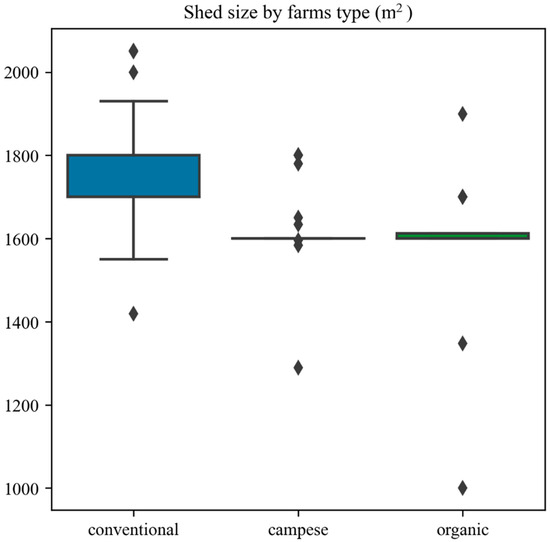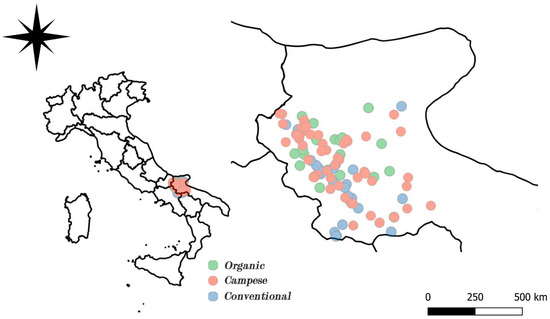 The present study examines the poultry supply chain in southern Italy, focusing on Foggia, and explores the potential for vertical integration. Considering the above aspects, the purpose of this study is to analyze the poultry chain in southern Italy and describe the characteristics of the farms and their locations, as a new perspective that not only considers the efficiency of business processes but also safeguards animal welfare conditions to improve food safety. Data were collected and organized into a dataset of 132 records of broiler chicken farms located in the province of Foggia (Italy). The following three types of poultry breeding systems were analyzed: conventional, organic, and Campese. Campese poultry breeding is a form of free-range farming where chickens have outdoor access and shelter for comfort, with stocking densities of 12 birds per square meter indoors and 1 bird per square meter outdoors [28]. It emphasizes distinct physical traits and a vertically integrated production system, ensuring quality and freshness [28]. Organic poultry breeding prioritizes animal welfare, environmental sustainability, and natural feed, with stricter regulations and lower stocking densities. Conventional breeding focuses on efficiency, using high-density housing and commercial feed, raising concerns about animal welfare and environmental impact due to intensive farming practices and higher stocking densities [29,30].
