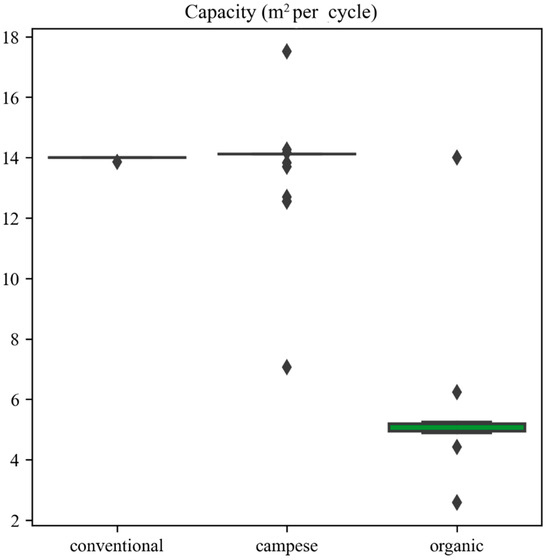 This is probably because the Campese farming system allows for the same number of cycles per year as the conventional farming system (five), but it also allows outdoor breeding (each shed needs two hectares for pasture); as a consequence, sheds are smaller and the cost of realizing them is lower (Figure 5), although the number of chickens per m2 per cycle remains more or less the same (Figure 6). On the other hand, the organic farming system leads to 30% less productivity than the other breeding systems (3.5 cycles per year), and the number of chickens per m2 per cycle is cut in half. It is also true that the Campese brand is a specific philosophy that includes a breeding system that is more compliant with animal welfare and meets consumers’ needs in terms of quality linked to sustainability and the animals’ mental and physical well-being.