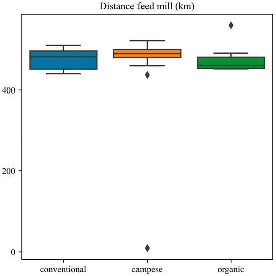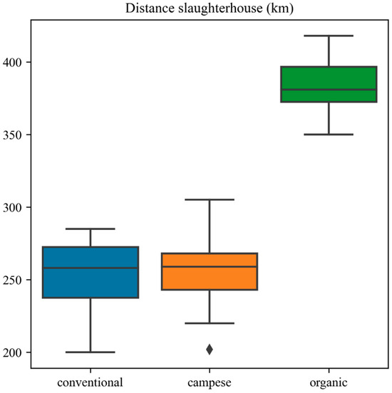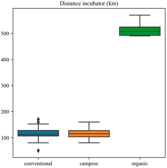 Figure 7 shows that the incubators for conventional and Campese farming systems tend to be located within 200 km, but for organic farming, the average distance is over 500 km. Figure 8 shows that the same distance of approximately 500 km was detected with respect to the feed mill for all three breeding systems. For the slaughterhouse, the same distances as in the incubator situation were detected. Indeed, Figure 9 shows a distance range of almost 250 km for conventional and Campese farms and about 400 km for organic farms.