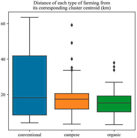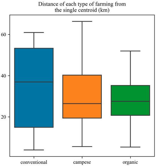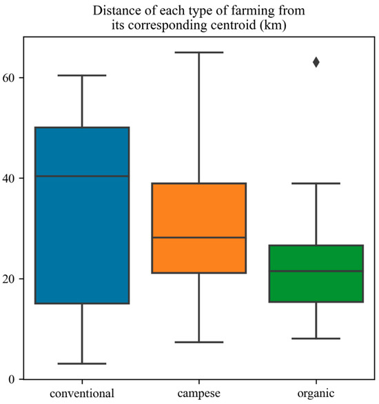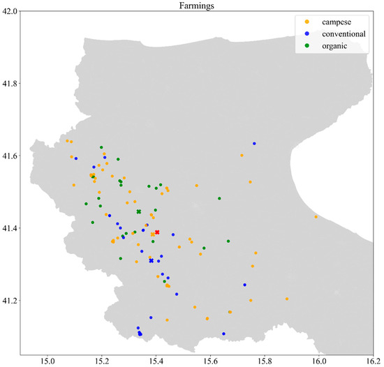 Starting with the farms’ coordinates, the centroid for each type of farming system was calculated using Equation (1). Figure 10 shows the centroid locations for organic farms (green), Campese farms (orange), conventional farms (blue), and all farms together (red).