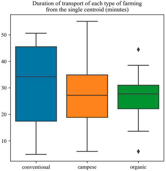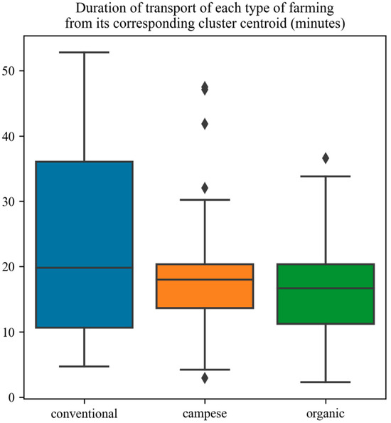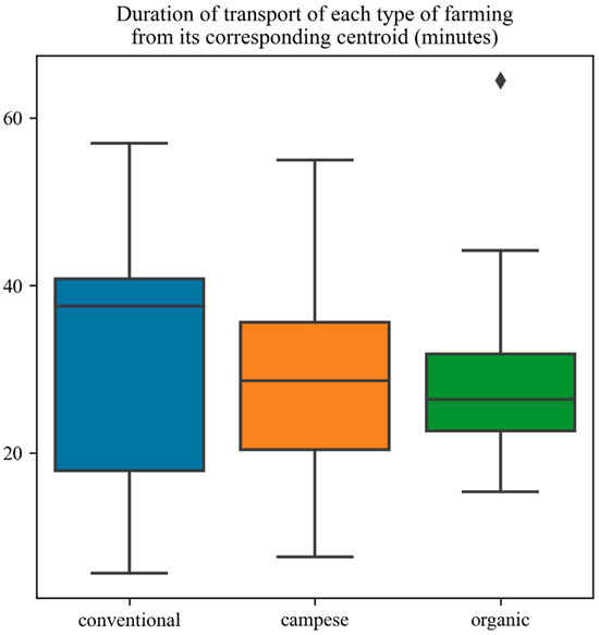 Length of the route between each type of farm and the corresponding centroid, measured in minutes, calculated using Google Maps API.