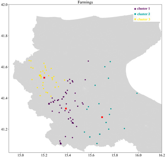 The Google Maps API v3.59 was used to calculate distances (in kilometers and minutes) from the farms to the calculated centroids. Google Maps API considers road conditions, road type, speed limits, and, if available, historical traffic data. In particular, the choice of route and duration are based on the road network and average time-independent traffic conditions (https://developers.google.com/maps/documentation/directions/get-directions#departure_time, accessed on 4 February 2025).